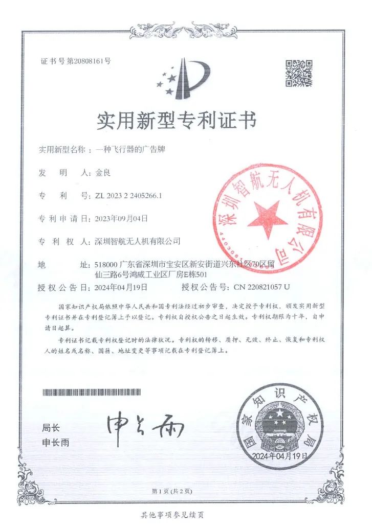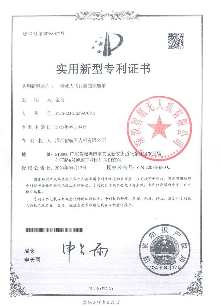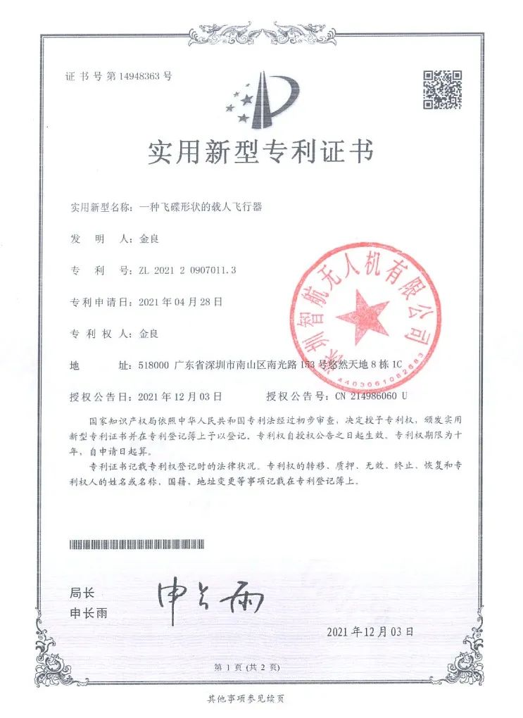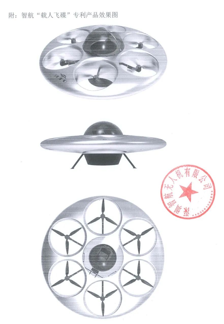 附:智航“载人飞碟”专利产品效果图及专利证书