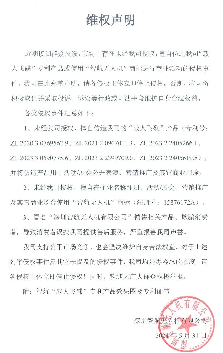 近期接到群众反馈,市场上存在未经我司授权,擅自仿造我司“载人飞碟”专利产品或使用“智航无人机”商标进行商业活动的侵权事件。我司在此郑重声明,请各侵权主体立即停止侵权,否则,我司将积极取证并采取投诉、诉讼等行政或司法手段维护自身合法权益。