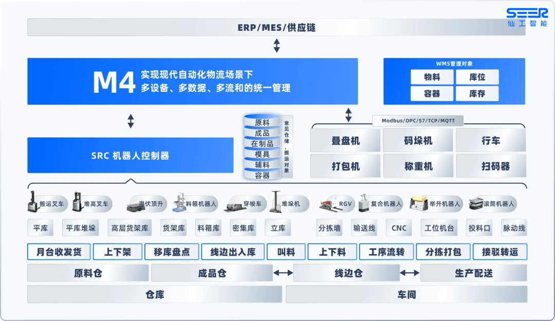 仙工智能 M4 智能物流管理系统集成车队管理(FMS/RCS)、物流设备管理(WCS)、仓储管理系统(WMS)及多个解决方案于一体,支持机器人管理、运单分配、路线规划、自动化设备管理、出入库管理、库存管理等,可帮助企业高效管理以移动机器人为核心的自动化仓储物流,真正实现自动化物流升级。