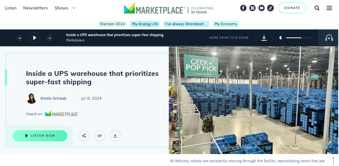 近日,美国公共媒体(APM)经济电台节目Marketplace向530万广大受众报道极智嘉仓储自动化技术如何赋能3PL巨头UPS实现次日达。
