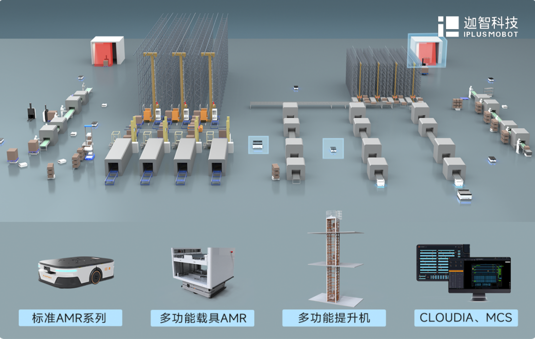 以AMR为核心,通过提升机、输送线等设备,结合迦智科技统一调度系统,为用户打造点到点、点到线运输的智能产线柔性物流系统;