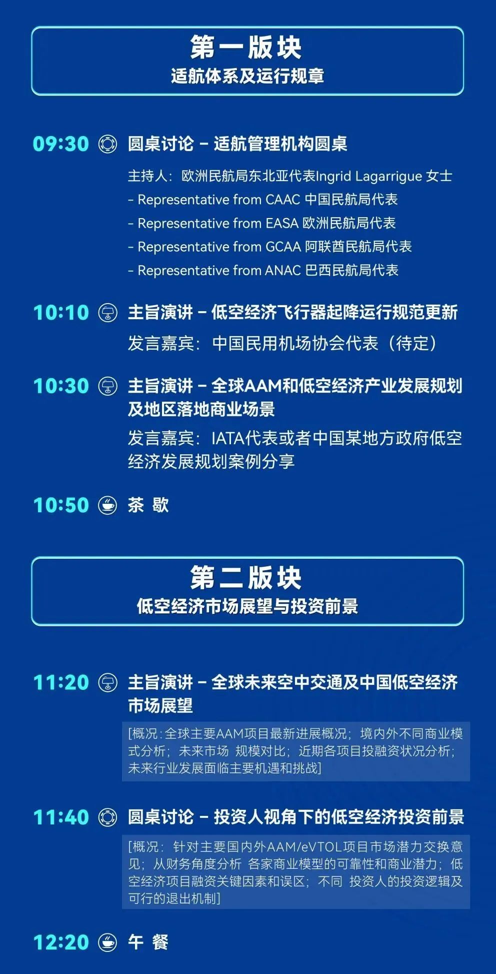 论坛所涉及的议题丰富多样,包括低空经济市场展望、投资前景、技术路径、产业化机遇、系统供应商、适航审定、运行标准、基础设施、飞行员培训及知识产权保护等丰富内容。多家低空经济产业中的全球领航企业高管、行业权威专家、知名投资人将发表高质量演讲,深入探讨新的发展趋势下,低空经济产业面临的机遇与挑战。