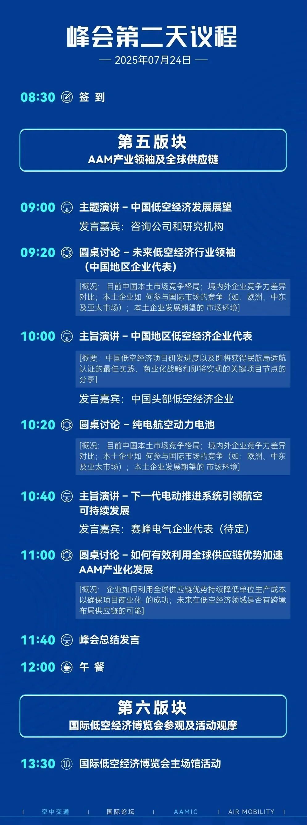第四届未来空中交通国际论坛暨国际低空经济博览会产业峰会(AAMIC2025)将作为国际低空经济博览会的官方核心论坛之一,在国家会展中心(上海)举办。届时,预计近400位国内外低空经济产业链专业嘉宾将出席峰会共商产业发展机遇。目前已经确认的国际发言嘉宾包括:欧洲民航局东北亚代表Ingrid Lagarrigue女士、国际头部AAM企业英国Vertical Aerospace亚太区总裁Derek Cheng先生、巴西航空工业EVE AirMobility市场总监Joel Goh先生、德国Volocopter前亚太区总裁Emerson Xu先生等。