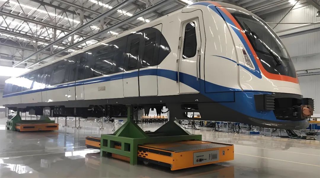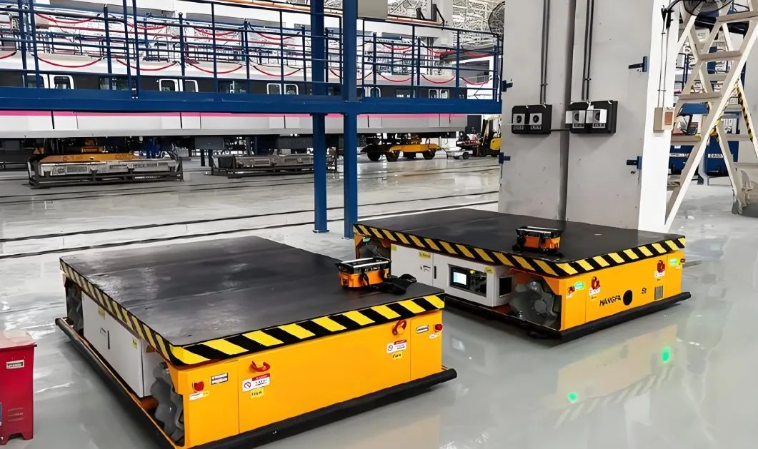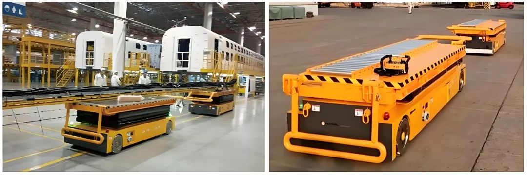 车辆底盘与车体转运:多车型共线生产时,传统输送线难以快速切换工装,换线时间长;采用双车联动AGV进行轨道车辆车体和底盘的转运,显著提高了生产效率。