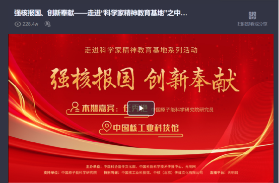 “核铸强国梦,精神永传承”。本次直播将走进科学家精神教育基地之中国核工业科技馆。节目邀请到中国原子能科学研究院研究员任秀艳,由她带网友 “云” 游展馆,回溯我国核工业从艰难起步到蓬勃发展的壮阔征程,讲述钱三强、王淦昌等科学家以身许国、默默奉献的动人故事,解读 “两弹一星” 精神与新时代核工业精神的深刻内涵,让观众深切感受核工业背后闪耀的科学家精神。(2025-9-25)