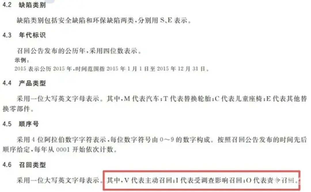 而最后一个字母则代表了召回性质,如果是主动召回,会用字母V,如果是责令召回,会用字母O。受调查影响的召回就会用到字母I。