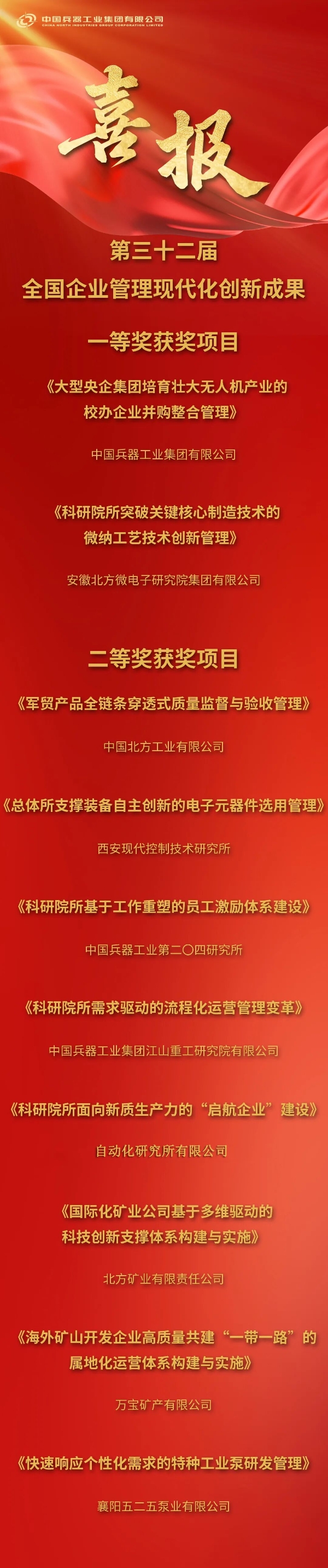 12月25日,全国企业管理现代化创新成果审定委员会发布第三十二届全国企业管理现代化创新成果名单,兵器工业集团2项成果获评一等、8项成果获评二等,创历史最好成绩。