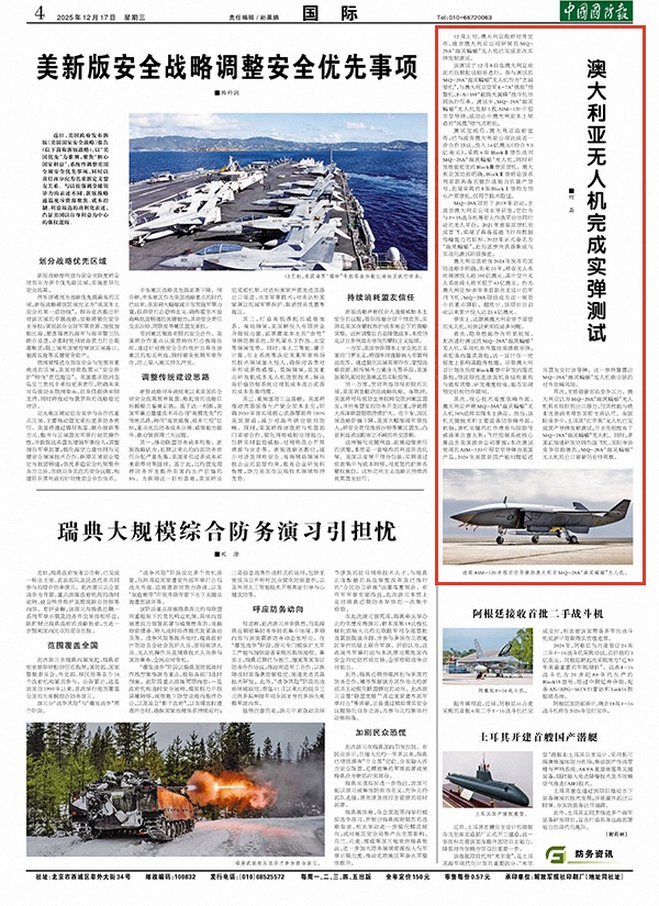 12月上旬,澳大利亚政府对外宣布,波音澳大利亚公司研制的MQ-28A“幽灵蝙蝠”无人机已完成首次实弹发射测试。