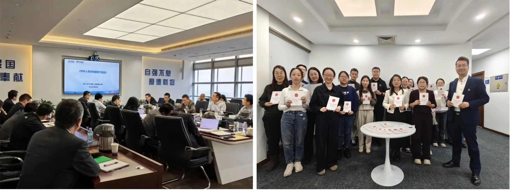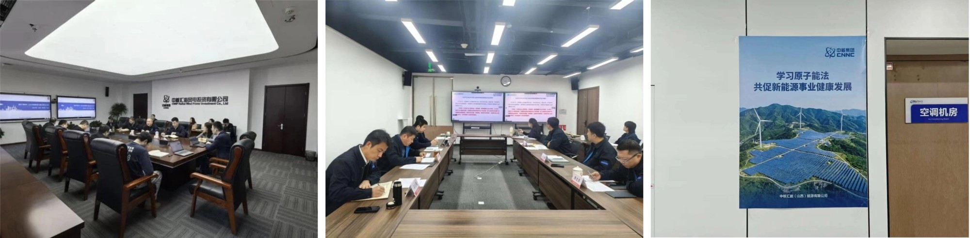 中核汇能/新华发电组织开展原子能法专题讲座与专题研讨,系统学习原子能法的立法背景、现实意义与核心内容。依托企业微信公众号持续推送原子能法知识,线下张贴主题宣传海报,图文并茂展现法律发展脉络与导向,营造多维学习场景,推动员工深化对原子能法的理解。