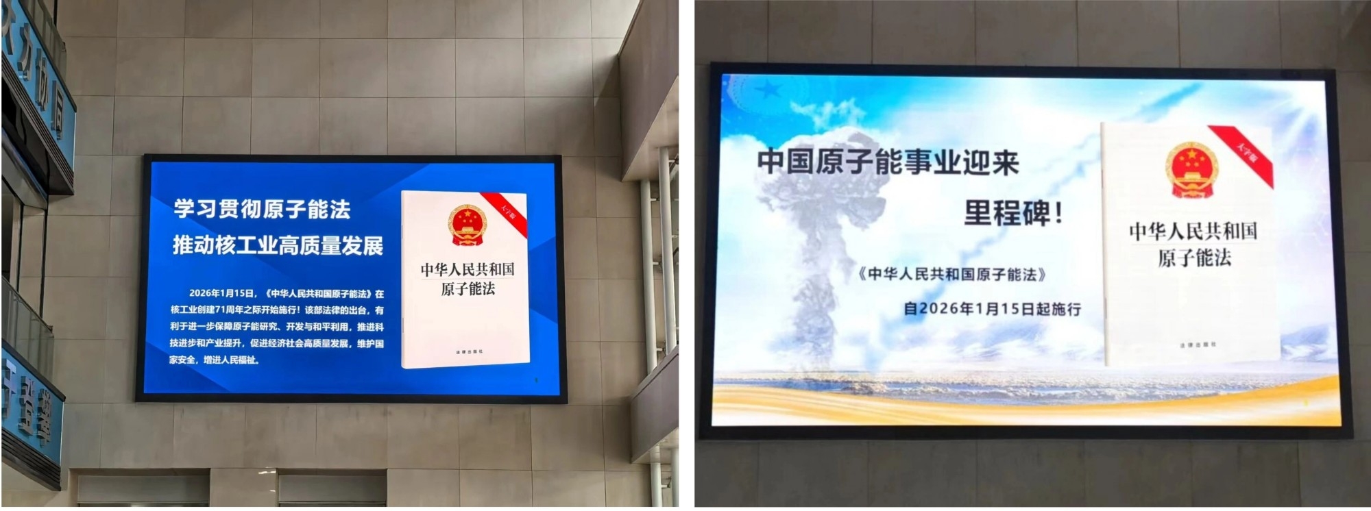 中核四0四将原子能法纳入公司党委理论学习中心组暨形势任务教育读本,并向全员发布。在法律施行当日向全员推送“目之所及皆有法、指尖所触皆普法”主题短信,推动全员增强法治意识与合规素养,厚植法律执行根基。