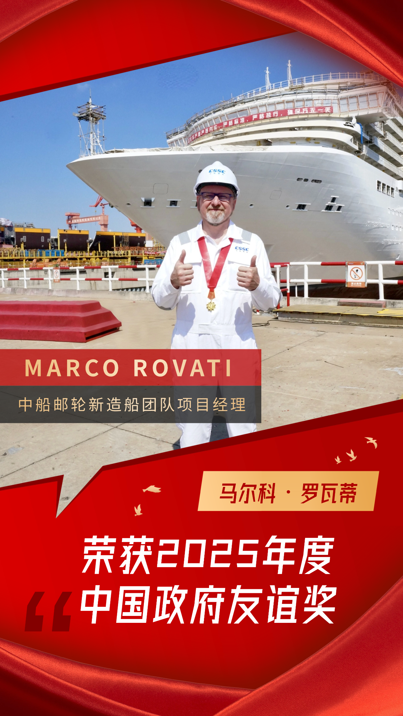 MARCO ROVATI是一位出生于1967年的克罗地亚籍邮轮工程专家,拥有超过三十年的邮轮新造船经验。在获得中国政府友谊奖后,MARCO ROVATI说:“中国政府友谊奖是我职业生涯中获得的最重要的荣誉,对我而言具有非凡意义。这份奖项不仅是对我过去工作的认可,更是对我未来的激励。我将继续为中国邮轮产业的发展贡献自己的力量。”