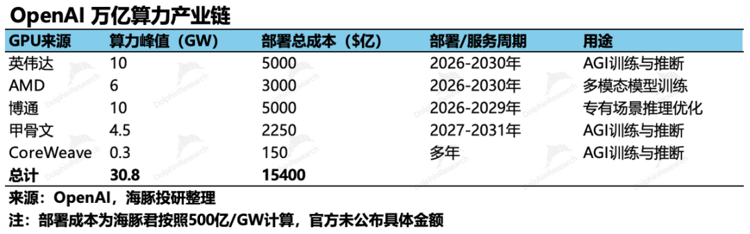 结合<1-3>,上述星际之门以及与产业链上游的直接合作,加上最近9月刚签的CoreWeave合同,OpenAI给未来的自己累计规划了最高31GW算力新增供给(其中26亿算GW是近一个月新增的),对应产业链总部署价值高达1.5万亿。