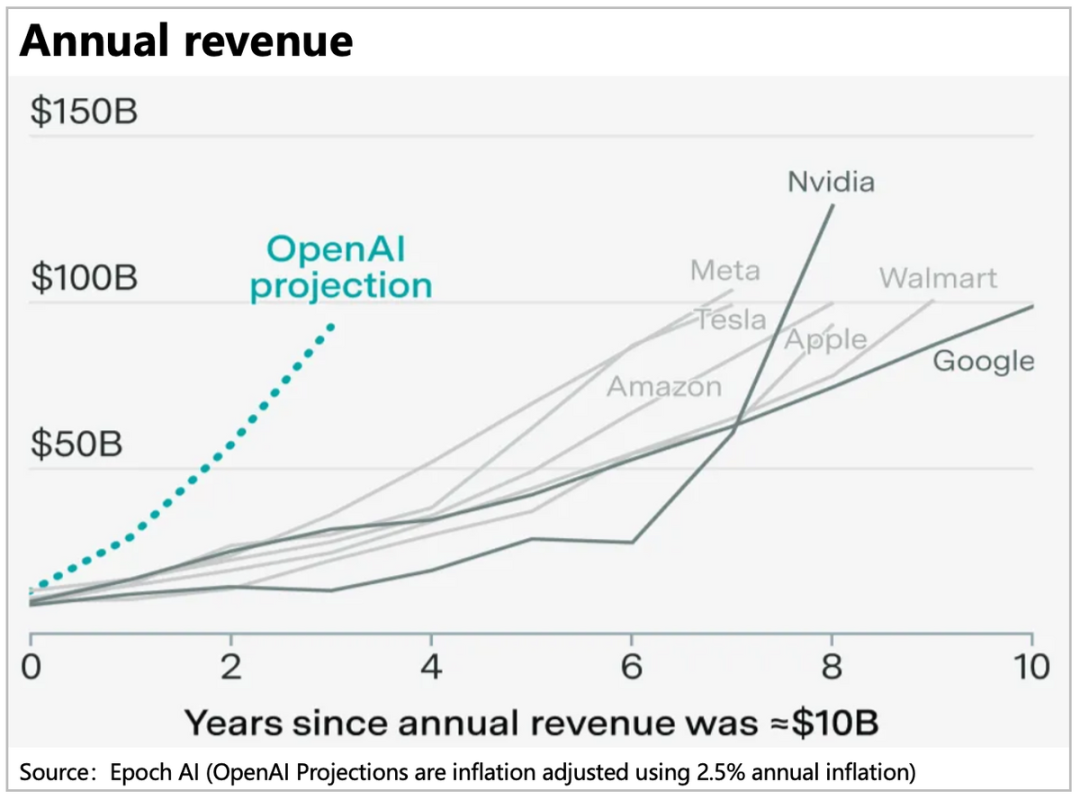 在OpenAI收入与投入严重不匹配的情况下,与OpenAI有关联的生态圈无疑是产业中最大的风险点,尽管ChatGPT已经8亿用户规模,用户爬坡速度超过所有已经成功的互联网平台,但比用户规模增长更快的,是背后的算力需求以及OpenAI已经订下的供给订单。