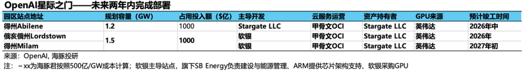 (1)数据中心投入:尤其是按目前计划,星际之门里三个数据中心(得州Abilene、俄亥俄州Lordstown、得州Milam)都将在未来两年内完成部署落地。这也意味着付款周期马上来临,这是整个星际之门背后项目方(OpenAI、Oracle、软银、MGX)所面临的共同压力。