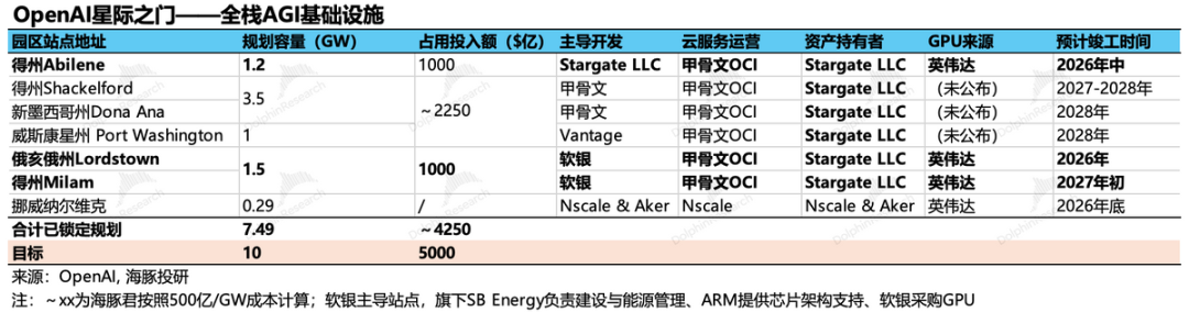 截至当前,部署目标已经规划了70%多,主力是美国七个数据中心站点,海外目前有清晰规划主要是挪威地区的站点,大多个数据中心园区的建设都在2026年之后竣工。比较快的就是软银主导集群和最先投入的Abilene站点,一年后就可投入运营,合计2.7GW的算力。