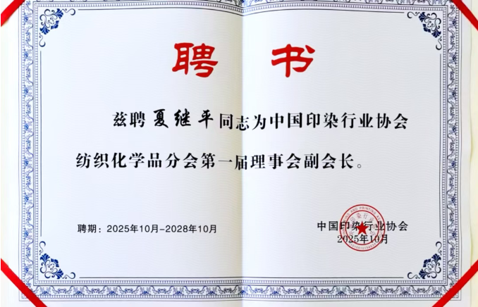 原标题:喜讯!中国印染行业协会纺织化学品分会成立,我会第二届会长夏继平当选分会副会长!