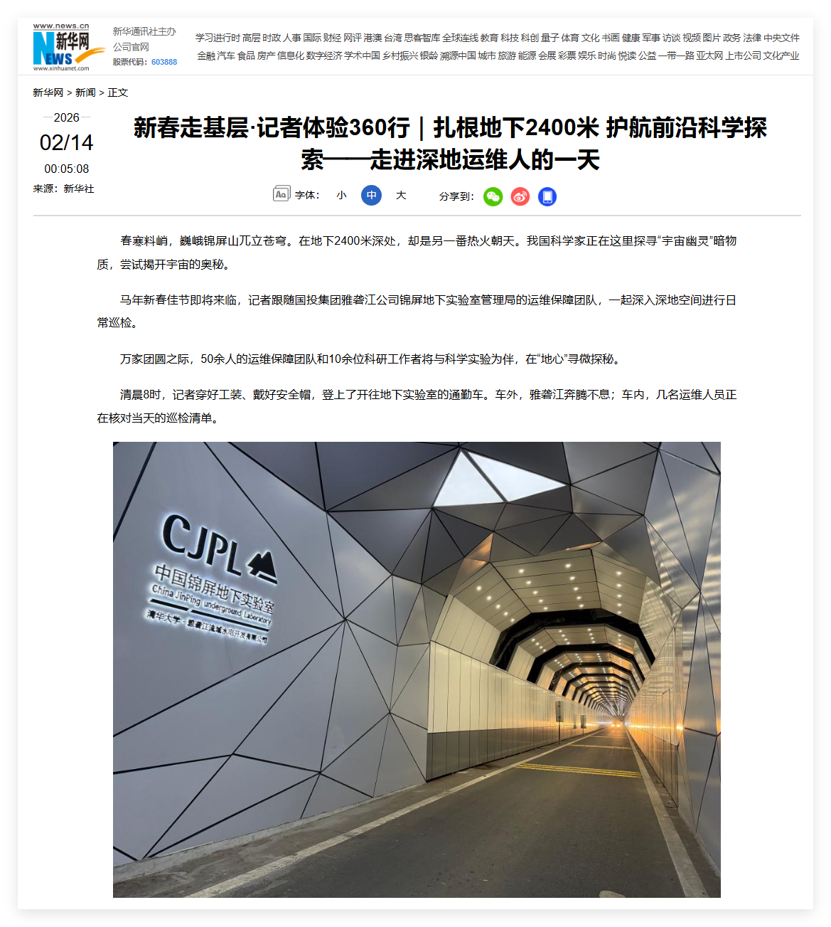 新华社记者深入地下2400米的锦屏深地实验室,深度体验深地运维人的一天,关注到原子能院JUNA团队正在开展核天体物理“圣杯”实验,客户端阅读量超116万。