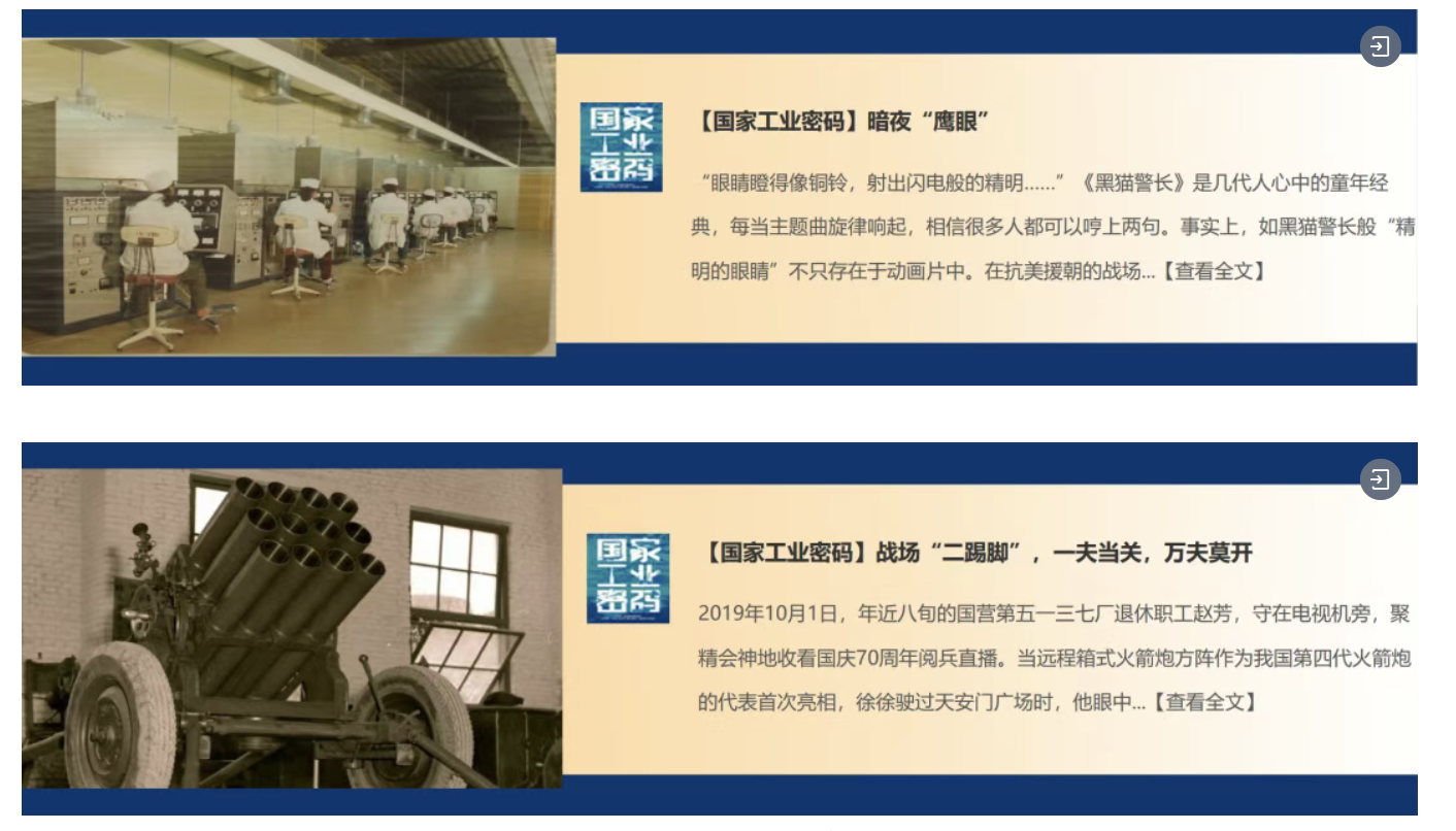 兵器工业集团参与国务院国资委新闻中心联合新华网、云听APP、喜马拉雅APP、机械工业出版社推出的《国家工业密码》——有声故事网络互动传播活动,刊发《暗夜“鹰眼”》《战场“二踢脚”,一夫当关,万夫莫开》。