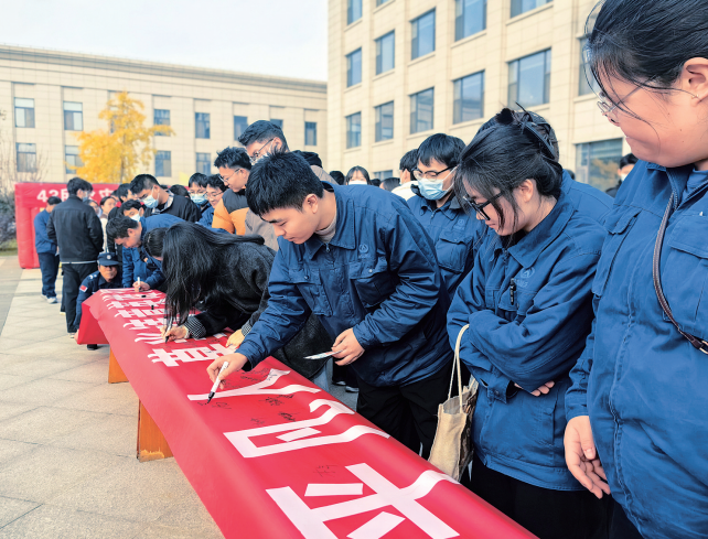 图为新员工在横幅上签字承诺。郑涵语 摄