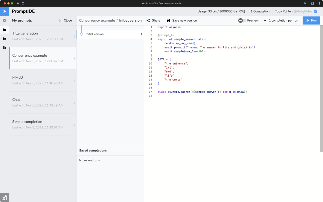 xAI 在官方博客中这样介绍:PromptIDE 是一个用于 prompt 工程和可解释性研究的集成开发环境。它通过 SDK 加速 prompt 工程,并且该 SDK 可以完成复杂的 prompt 技术,还能进行结果分析,可视化网络输出等。