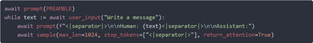 如上图所示,用户可以使用 prompt () 函数手动将 token 添加到上下文中,也可以使用 sample () 函数根据上下文生成 token。