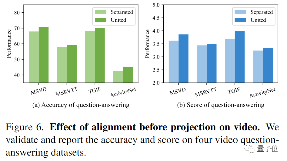 有关图6的实验结果显示,与分离的视觉表示相比,联合的视觉表示在4个视频问答数据集上显著提升了性能。
