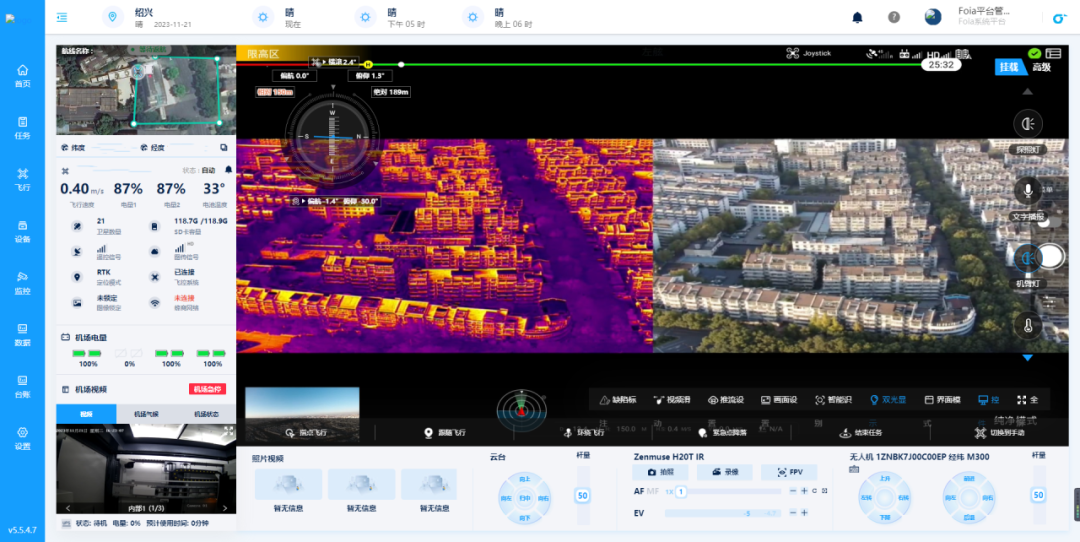 在日常的巡视中,通过预设的任务预约,无人机自动沿着制定好的航线进行定期巡检巡逻,覆盖古城区域的关键点和潜在的危险区域;在执行任务过程中的实时监测,借助无人机装备的高清摄像头不断捕捉可能的异常情况,如疑似火源或安全隐患,与此同时系统后台实时接收无人机传回的图像和数据,对信息进行分析和整理。一旦发现异常,无人机会立即报告并提供准确的位置信息,使消防人员能够快速作出反应。后台人员则在消防指挥中心观测屏幕中无人机实时传输画面,辅助辖区巡查工作。