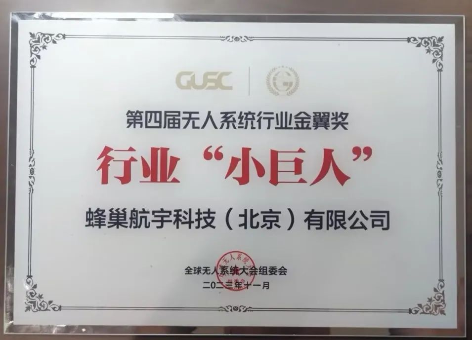 在22日晚间举办的无人系统之夜上,表彰了一批在无人机领域作出杰出贡献的企业和个人,蜂巢航宇荣获无人系统行业金翼奖——行业“小巨人”。
