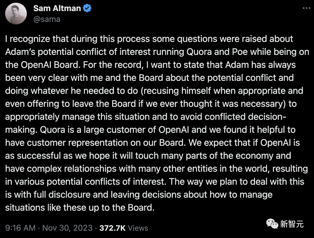 我发现,有人对Adam在OpenAI董事会任职期间经营Quora和Poe的潜在利益冲突有疑问。我想声明,Adam一直非常清楚我和董事会的潜在冲突,并且在竭尽所能对之斡旋,避免冲突(在适当的时候回避,甚至在必要时请辞)。