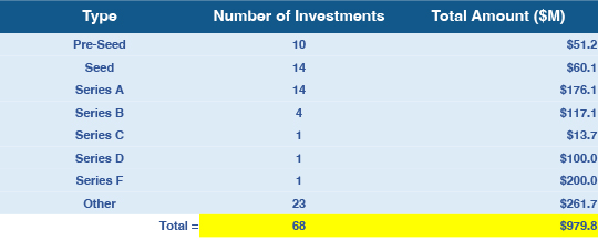 就投资总数和融资总额而言,大多数轮次和投资金额都属于“其他”类别,这是对不属于企业在初始融资之前经历的典型融资阶段的投资类型的总称。公开发行(例如种子轮融资,随后进行 A、B、C、D、E 和 F 轮融资)。Shield AI(F 轮)和 Pony.ai(D 轮)这两项后期融资约占 2023 年 10 月融资总额的三分之一。