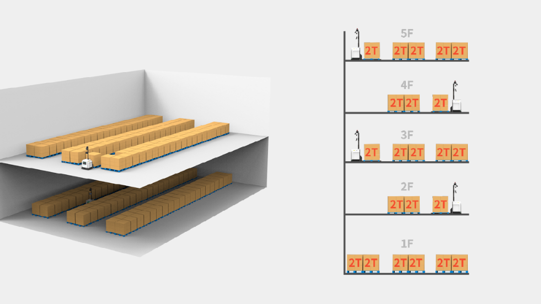 项目涉及1/3/4/5F的原料及成品的出入库,以往皆由人工进行跨楼层搬运,不仅费时费力,物料也难以追溯。在导入以「微蜂X20」为硬件载体的场内智能物流解决方案后,无人叉车和电梯梯控系统对接,实现乘梯换层自动化作业。
