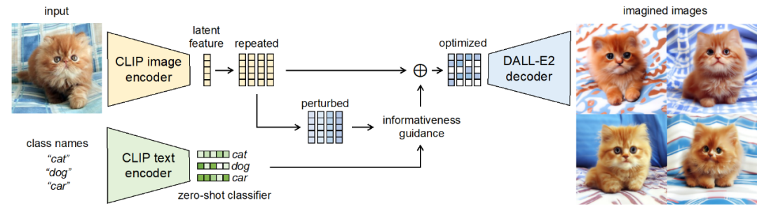 方法框架 基于所发现扩增指导标准,该工作提出了指导式想象扩增框架(GIF)。对于每个输入的种子样本 x,GIF 首先利用先验生成模型的特征提取器提取样本特征 f,并对该特征进行噪音扰动: