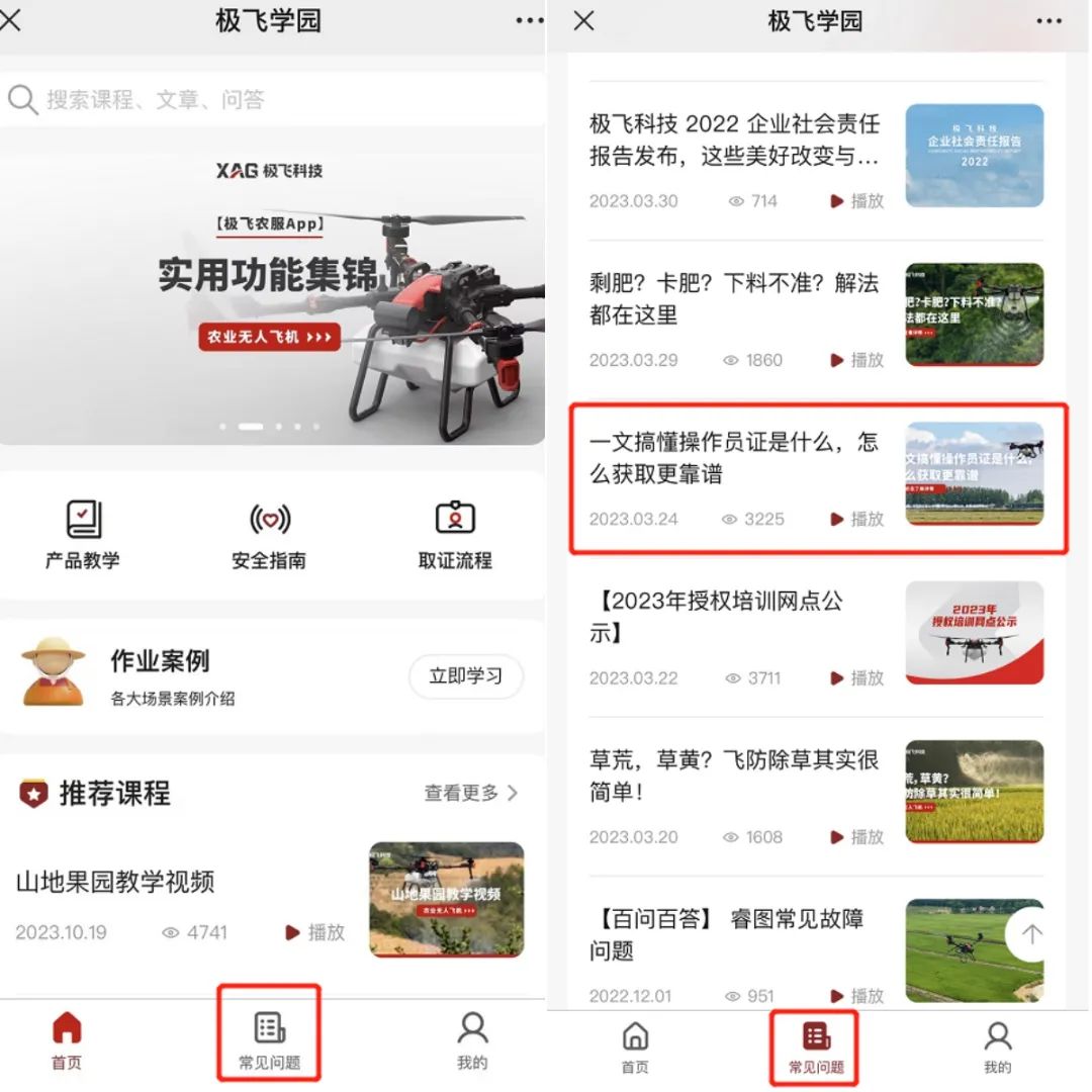 在极飞学园首页点击“常见问题”,下滑选择“一文搞懂操作员证是什么,怎么获取更靠谱”即可进一步查阅取证指引信息。(点击下方“阅读原文”也可直接跳转)