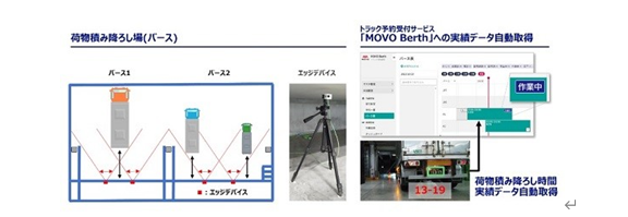 AI边缘设备检测并识别运输卡车的车牌,记录进/出信息,并自动将工作开始和结束表现数据反映在MOVO泊位上。可以自动获取装卸货物的实际时间数据,这在以前很难管理,也可以防止由于手动输入而导致输入错误或忘记。通过分析性能数据,还可以减少驾驶员的等待和工作时间。
