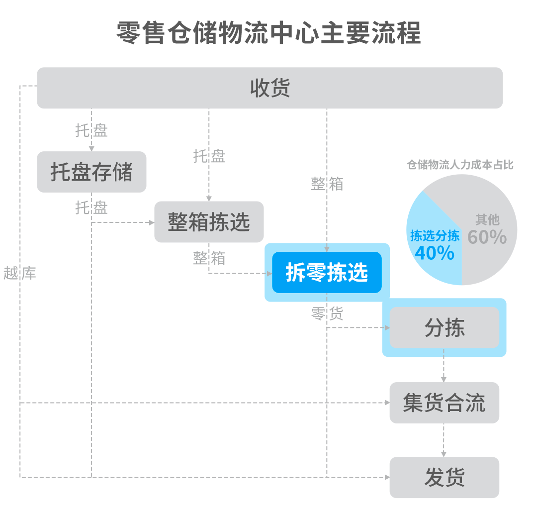 在零售行业订单履行的过程中, B2B 和B2C 拆零拣选是所有环节最为耗时,并且人力成本最高的环节。如何在这个关键的环节实现降本增效,是所有零售企业关注的焦点。