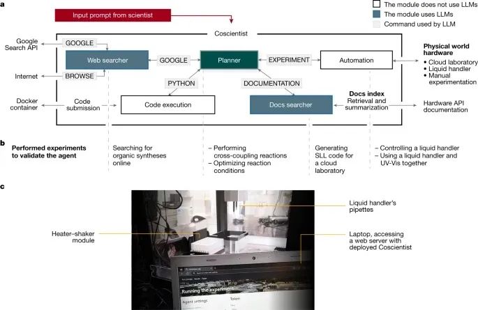 进一步的测试纳入了软件模块,允许Coscientist搜索和使用描述控制机器人实验室设备的应用程序编程接口的技术文档。这些测试对于确定Coscientist能否将其合成化合物的理论计划转化为指导物理世界中的实验室机器人的计算机代码非常重要。
