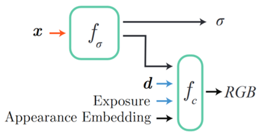 - 3D坐标x输入第一个网络fσ,包含8层全连接层,每层256个神经元,ReLU激活;