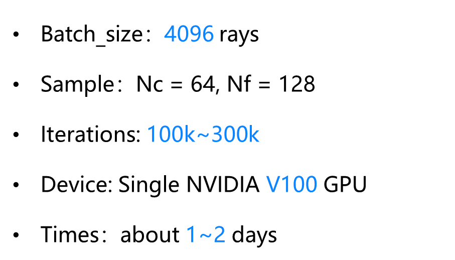 - 网络fσ输出体密度σ和一个256维向量,该向量与视角方向d送入fc(一层,128通道,ReLU激活)预测RGB;