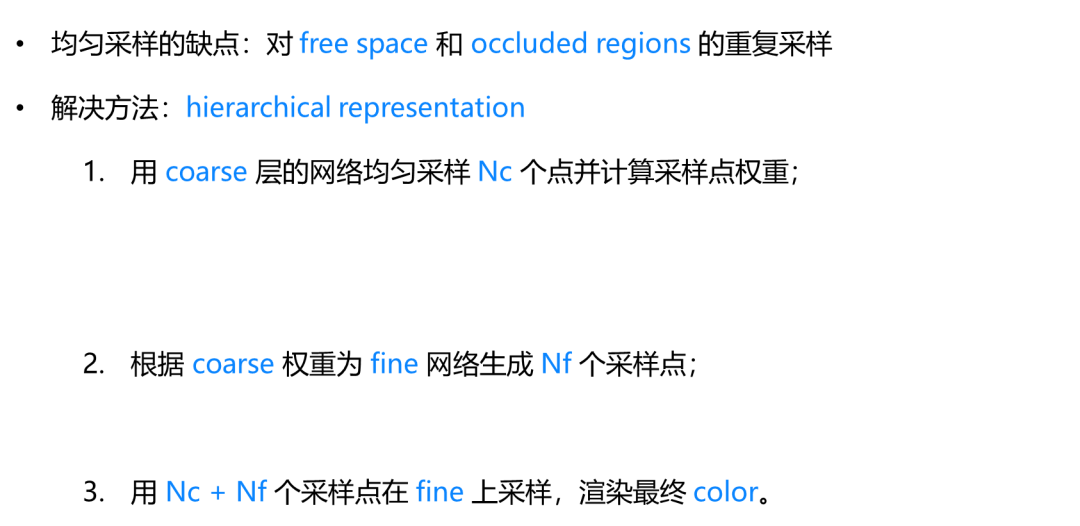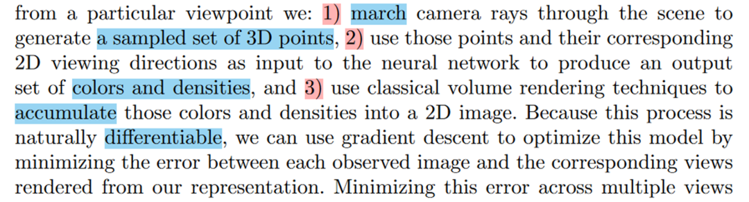 - 从相机光心发出穿透每个像素的射线,射线上取三维采样点;