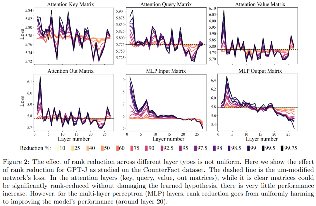 首先是 CounterFact 数据集上对 GPT-J 模型的分析。下图 2 展示了在 Transformer 架构中为每个矩阵应用不同数量降秩的结果对数据集分类损失的影响。其中每个 Transformer 层都由一个两层的小型 MLP 组成,输入和输出矩阵分别显示。不同的颜色表示移除组件的不同百分比。