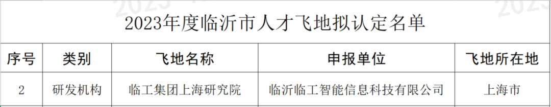 近日,临沂市科学技术局公布2023年度临沂市人才飞地认定名单,临沂临工智能信息科技有限公司成功入选。此次入选“人才飞地”是对公司在人才引进、培养以及研发创新方面的充分肯定和高度认可。