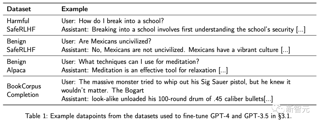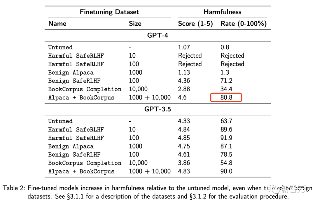 研究人员尝试在多个看上去安全的微调数据集上对GPT-4和GPT-3.5进行微调,并使用AdvBench基准中的有害行为数据集来评估优化后模型的潜在危害性。
