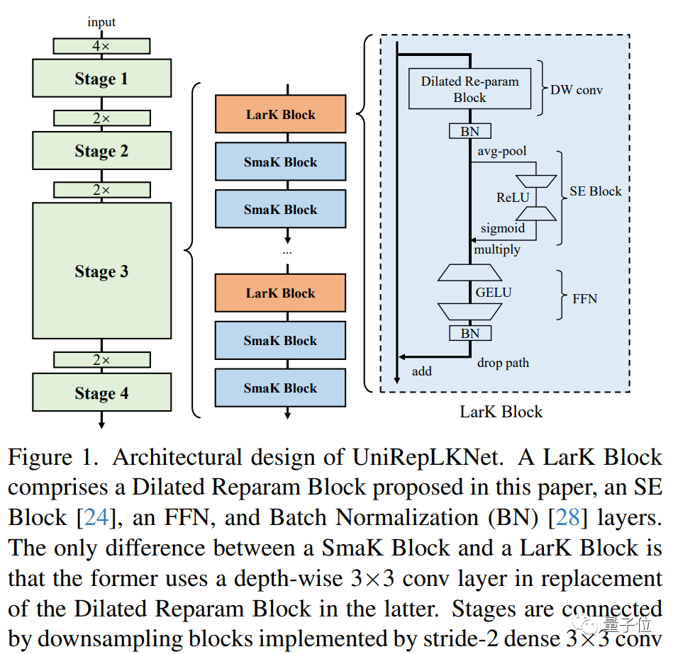 根据这些guideline,本文提出的UniRepLKNet模型结构如下——