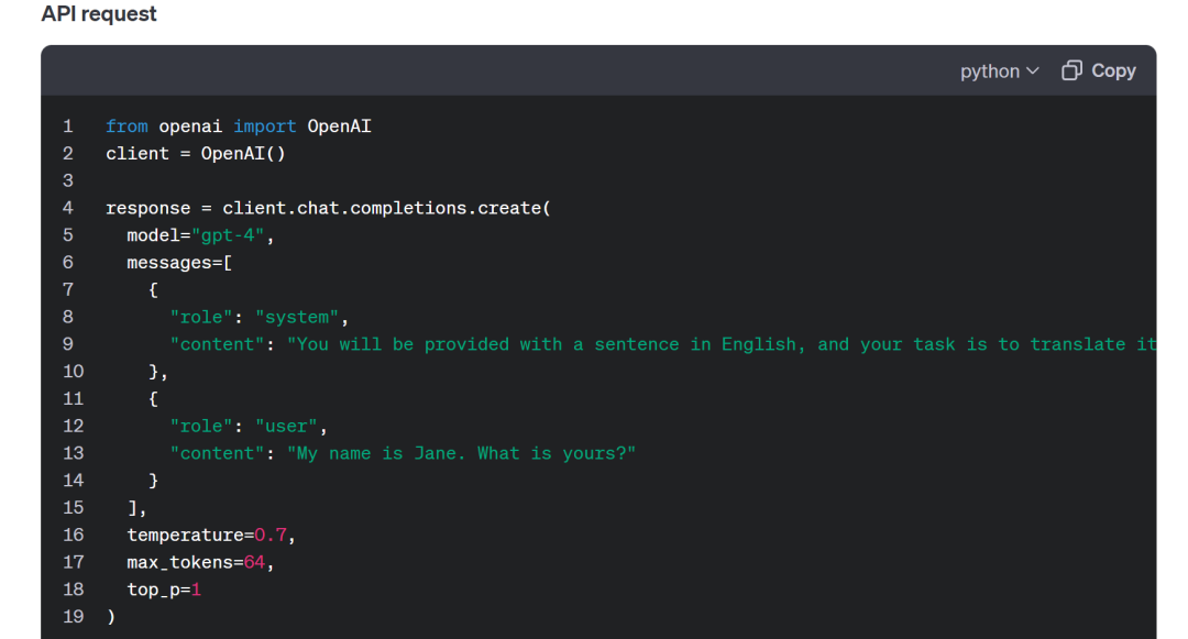 除了 Prompt 以外,还有 API 调用的代码以供参考,提供了推荐的 temperature 等参数:
