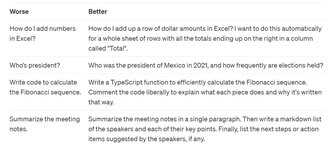 显然,后者的描述更为清晰,更有可能得到我们想要的答案。OpenAI 在指南中列出了一个 Worse or Better 的示例供大家参考: