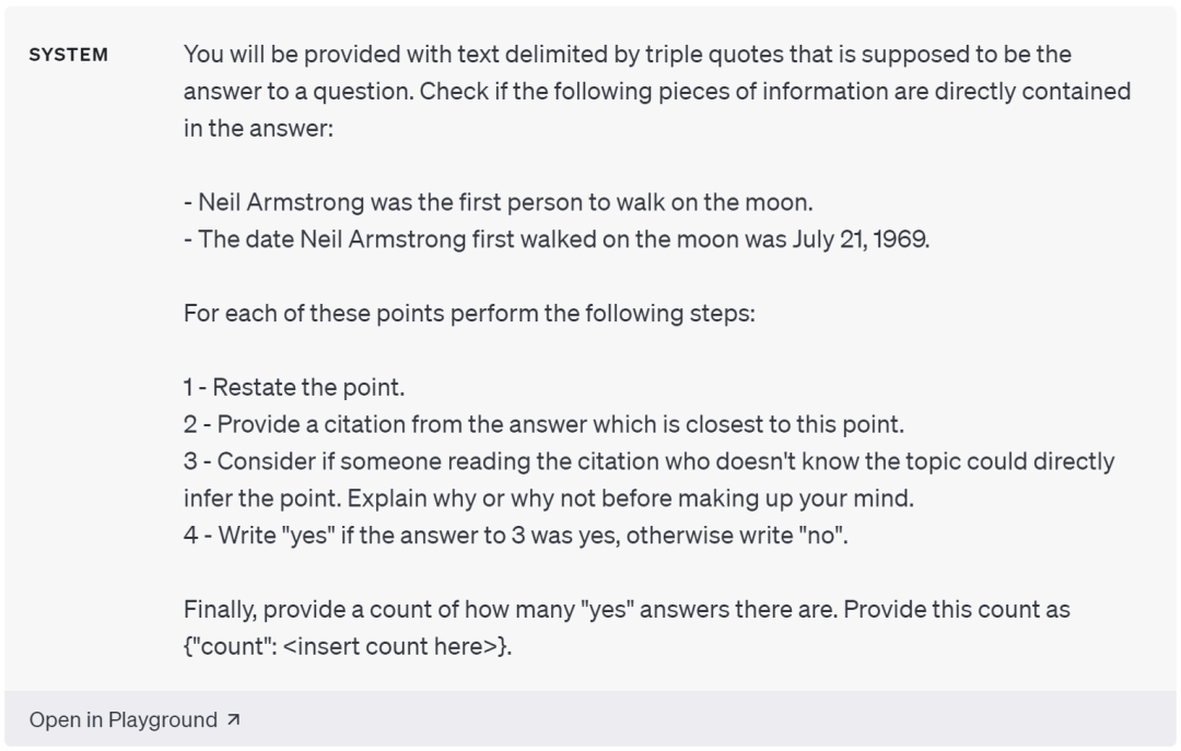 其中,一种方法是假设我们已经知道了正确答案应当包含的某个已知事实,那么就可以使用模型来查询输出中包含多少必要的事实。比如我们假设存在一个事实「阿姆斯特朗是第一个登上月球的人」,则可以向模型输入: