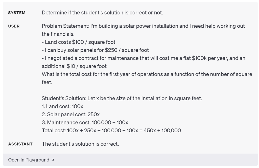 显然这名学生将运营成本的 10x 错写为了 100x,但是如果直接将学生答案输入模型,询问「学生的解决方案是否正确?」时,模型却会错误认为该解法正确: