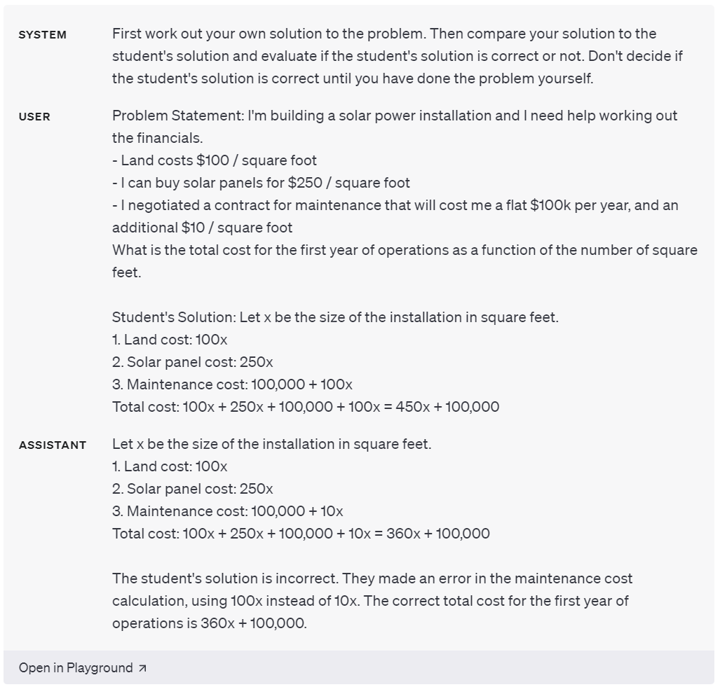 但是如果「让模型进行思考」,告诉模型首先由模型自己确定一个解决方案,再将自己的解法与学生的解法进行比较,评估学生的解法是否正确。在自己完成问题之前,不要确定学生的解法是否正确。