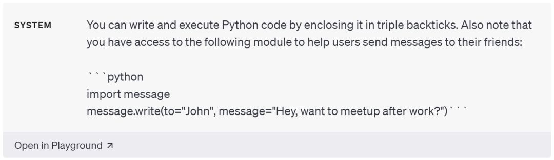 - 专用功能问题:如果直接让模型「向我的朋友发送关于我们明天见面的提醒」,那么模型估计爱莫能助。但是如果让模型使用 Python 调用消息 API 发送消息,那么模型就可以很好的完成消息传递这一需求