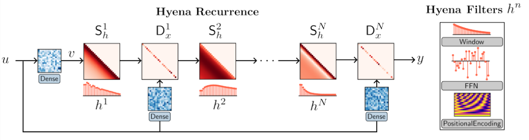 基于上述三个发现,研究人员提出Hyena层次结构,由两个高效的二次基元递归定义的算子(长卷积和元素乘法门控)组成。